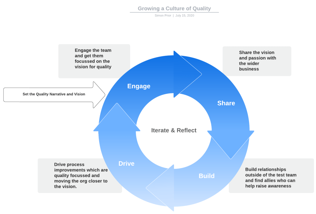 In bigger organisations where there are engineering groups everywhere, it will be important to use shared communities of practice to build the knowledge and share good practices. It will be important to set achievable goals like improving the view of Quality across your engineering group first including all stakeholders outside of engineering. But don’t try to boil the ocean, use regular reflection and feedback to know when to push yourself further or when to focus on honing what you have already achieved.