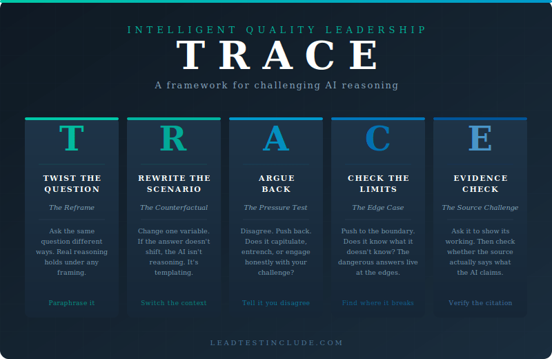 So here’s a framework I’ve been developing: TRACE. Five challenge moves that let you interrogate AI reasoning in a structured, repeatable way. I’ve been actively using this over the last couple of months while developing the apps at home during my time out of work. It’s really helped me understand the nuances of testing AI solutions.